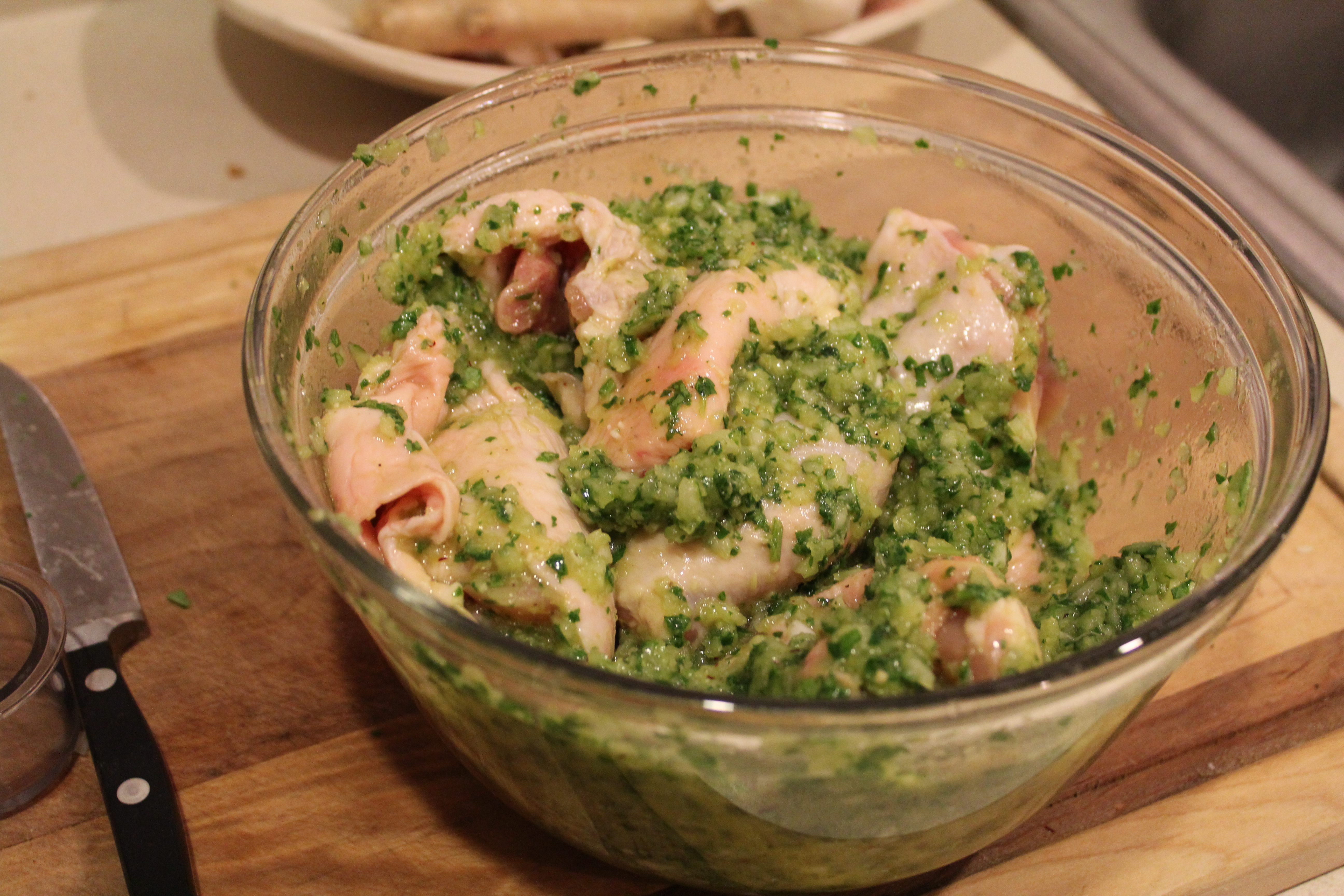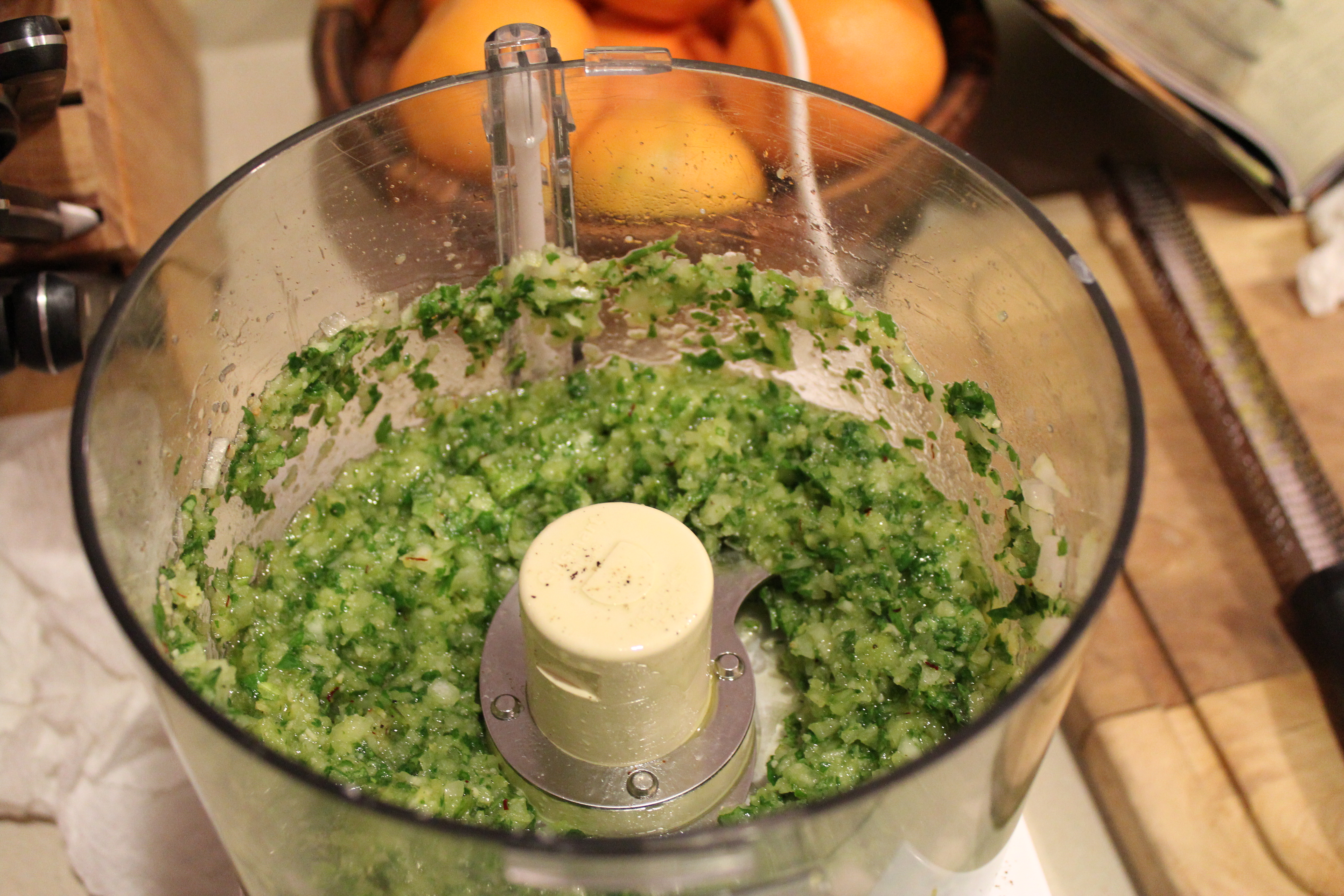 First things first – make the marinade. Above is a picture of the items you’ll need for the marinade – minus the saffron which I forgot to include. But you’ll need a pinch of that as well. Combine the diced onion, cilantro, lemon juice and zest, saffron, salt and pepper in the food processor. Once it gets to an even consistency, drizzle in the olive oil as the motor is running – and the finished product should look like this: