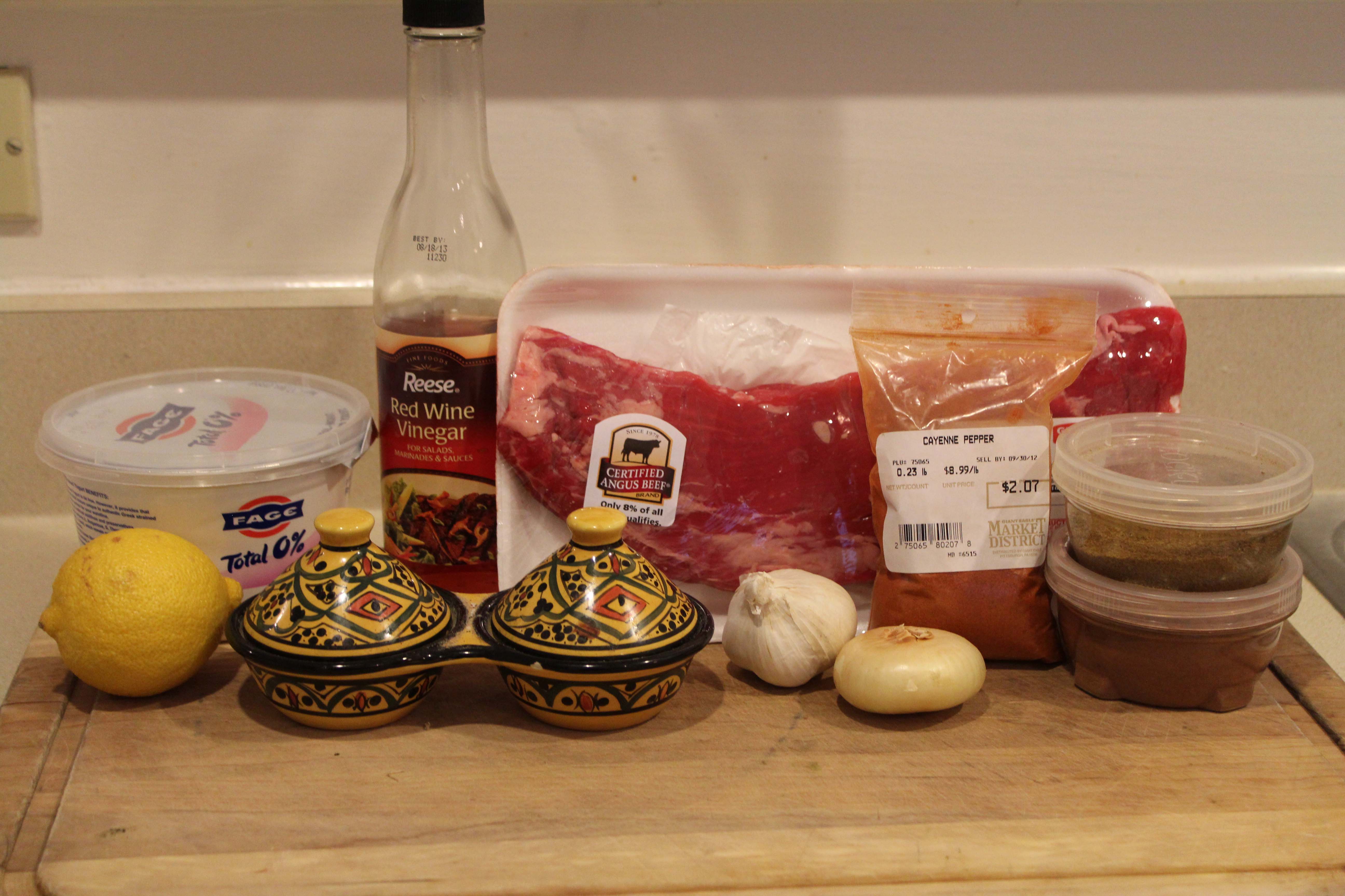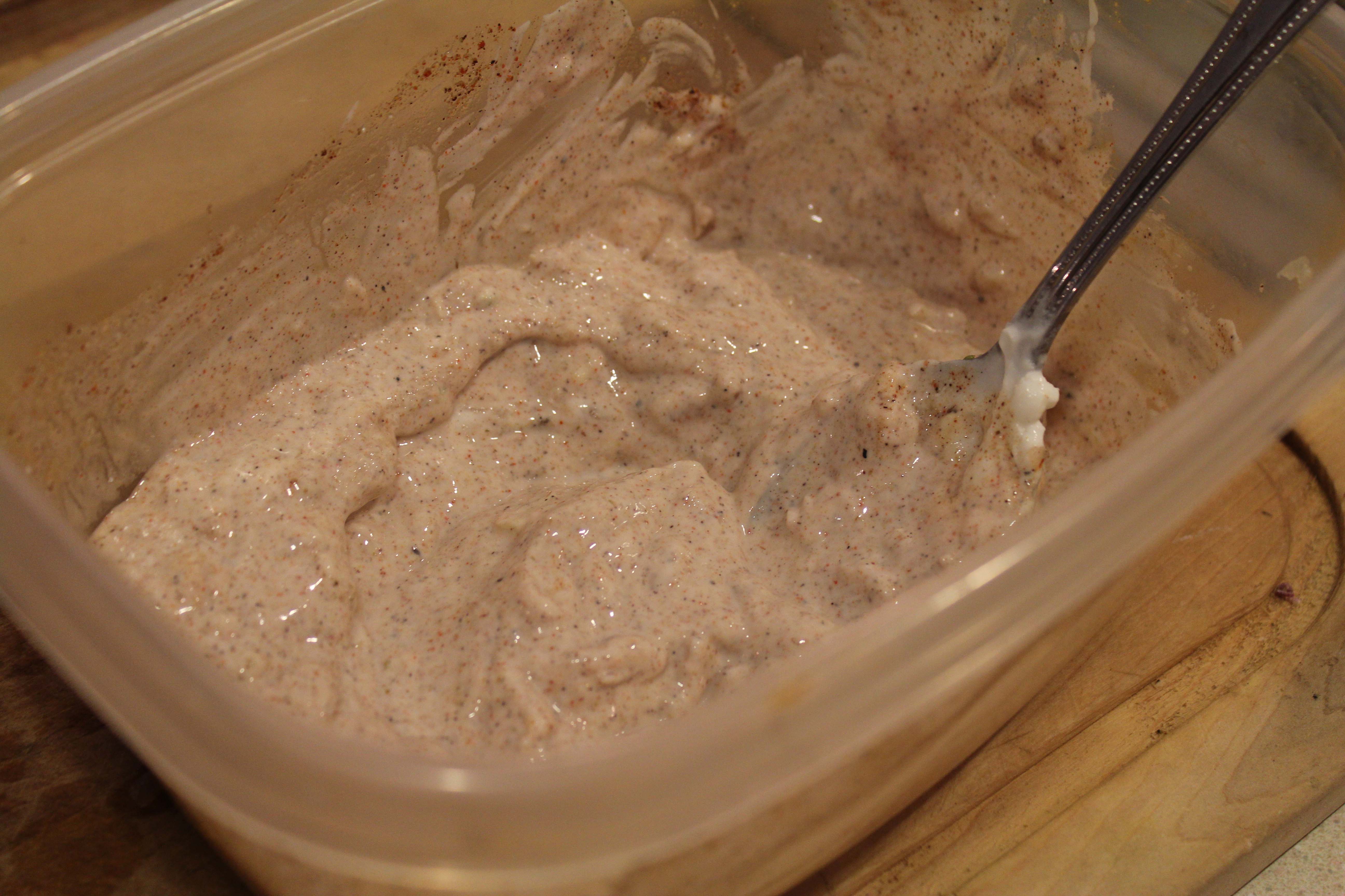 Combine all the ingredients pictured below. Yogurt might seem like an odd choice to you as a marinade….trust me. There’s something in the enzymes that break the meat down and really tenderize it. I like to use yogurt to marinate chicken all the time b/c it keeps it insanely moist as well.
