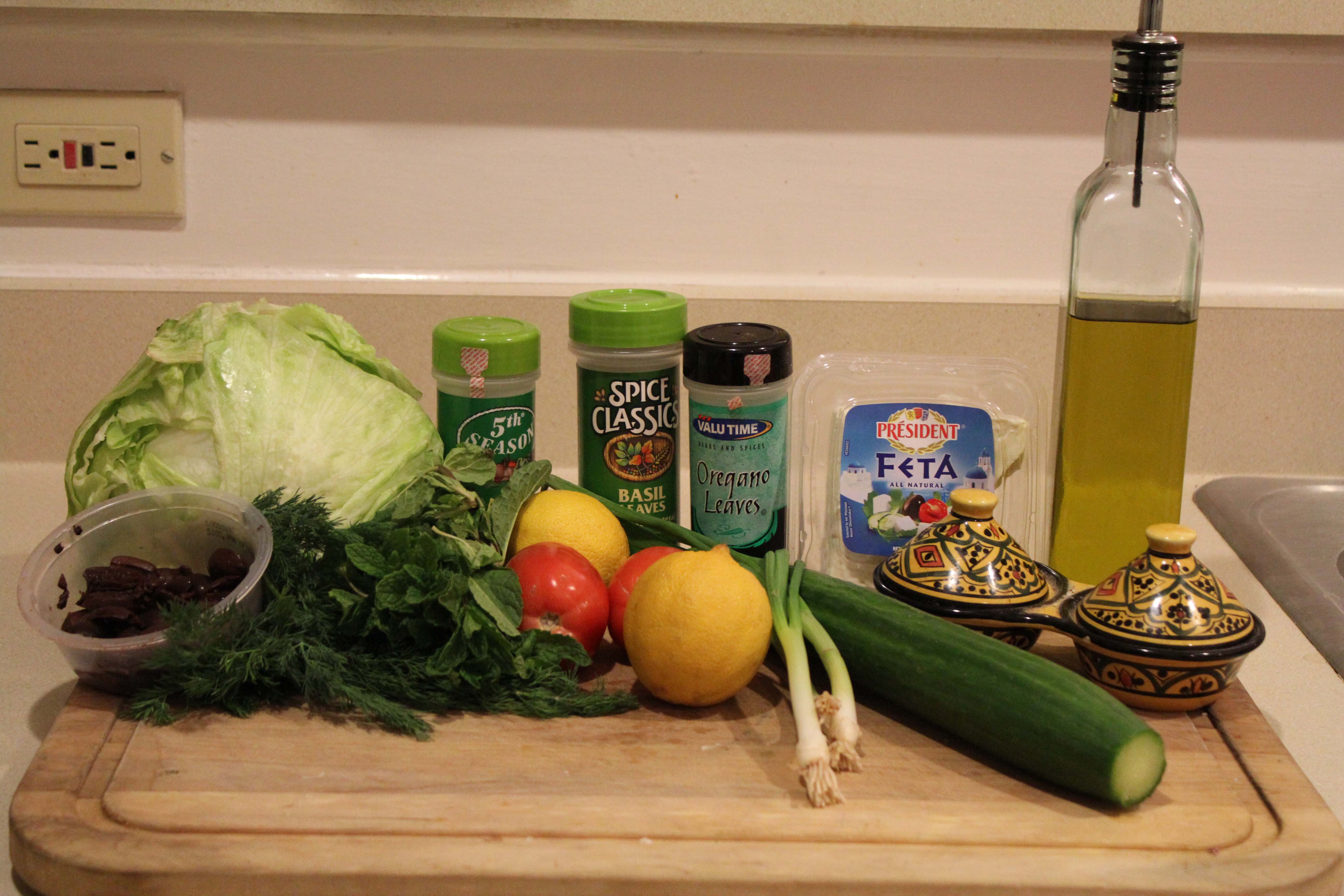 Now its time to assemble the salad. For my salad I sliced half of a roma tomato, 4 slices of cucumber, and one green onion (green parts only). Then I added in about 4 kalamata olives and a ¼ cup of feta cheese.